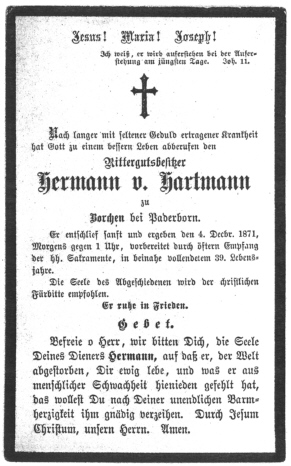Carl von Hartmann (1788- 26. 3. 1842) führt seit dem Tod seines Vaters Georg Anton (geb. 1749) am 4. 4. 1819 das Oberhaus in Borchen zusammen mit seiner Mutter Bernhardine, geb. von Pein aus Paderborn (Haus Nr. 8 am Markt) Unter Georg Anton und Carl von Hartmann kam das Oberhaus zu neuer Blüte. Es wird von 390 Morgen auf über 1500 Morgen Wald und Ackerland erweitert. Im Zuge dieser Erweiterung erwirbt Georg Anton von Hartmann am 9. 4. 1812 von dem Major von Haxthausen-Lippspringe den unweit von Hamborn gelegenen Forstbezirk Rengel zur Größe von ca. 100 Morgen für 2408,70 Francs oder 620 Tlr Conventionsmünze. Am 31. 1. 1822 erwirbt Carl von Hartmann den einen Hamborner Hof (das Ottensmeyersche Colonat, den Ottenshof). 1929 kauft er das Waldstück “Schnarmanns Holz” (54 Morgen) von Reichsfreiherrn Franz Egon von Fürstenberg. 1833 erwirbt er durch gerichtlichen Zuschlagsbescheid Eiferslohn