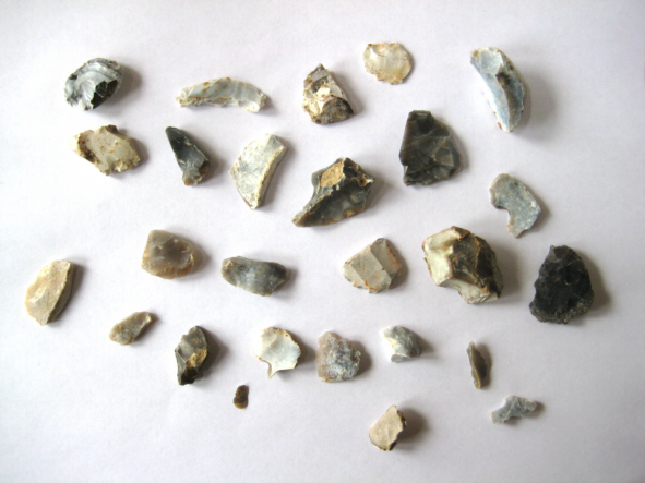 Das Ergebnis einer Feldprospektion: Feuerstein-Artefakte aus der Steinzeit. Fund beim Kirchborchener Erdwerk.