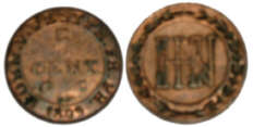 Napoleon setzte seinen Bruder Gerome als König Hieronimus von Westfalen ein. Zu dieser Zeit gehörte Hamborn zum Canton Kirchborchen im Distrikt Paderborn und im Departement Fulda mit Sitz in Kassel. Von dort aus herrschte Hieronimus. Die Rückseite dieser 5 Centimes zeigt deutlich seine Initialen HN = Hieronimus Napoleon.