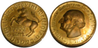 Dann kam die Inflation. Dieses 10000 Mark von 1923 wurden noch in einer Bronzelegierung geprägt,